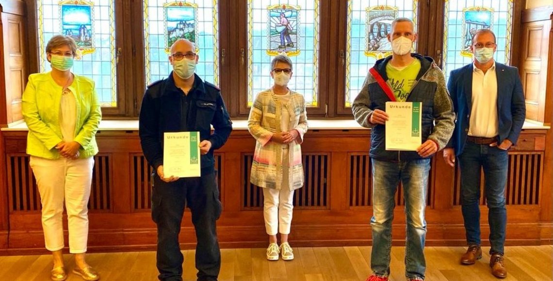 Geschäftsführerin Bettina Hörter und Bürgermeister Jörg Lempert beglückwünschten die neuen Beauftragten „Der Volksbund Deutsche Kriegsgräberfürsorge leistet einen ganz wichtigen Beitrag im Umgang mit der deutschen Geschichte. Es ist nicht selbstverständlich, dass auch junge Menschen sich mit den oftmals in Vergessenheit geratenen Folgen der beiden Weltkriege auseinandersetzen und den Entschluss fassen, aktiv zu helfen.Wir wünschen Steffen Welsch und Matthias Künster viel Erfolg für ihre neuen Aufgaben.“