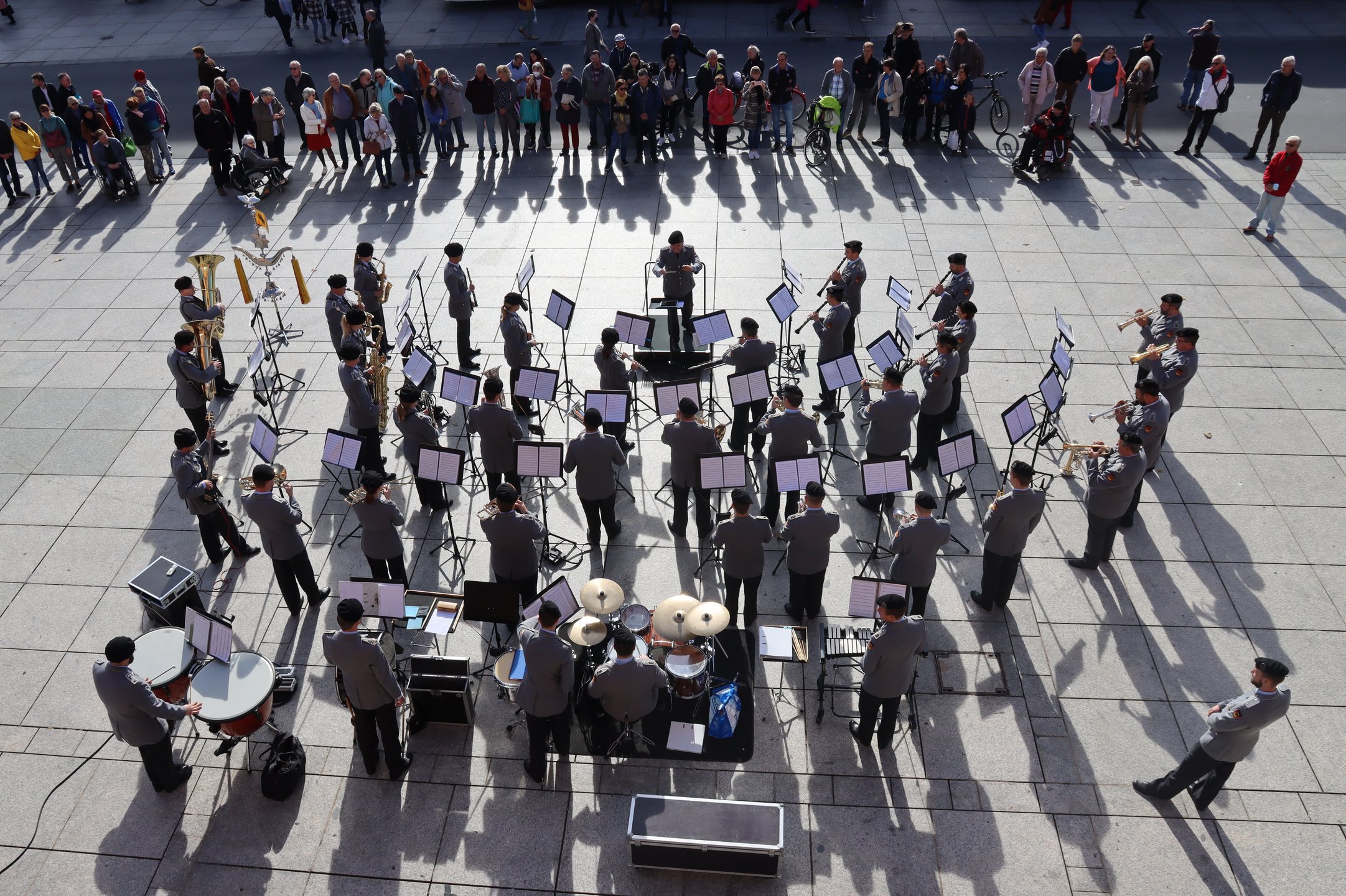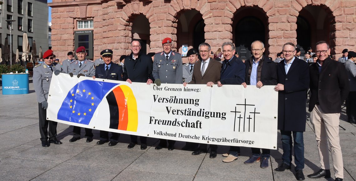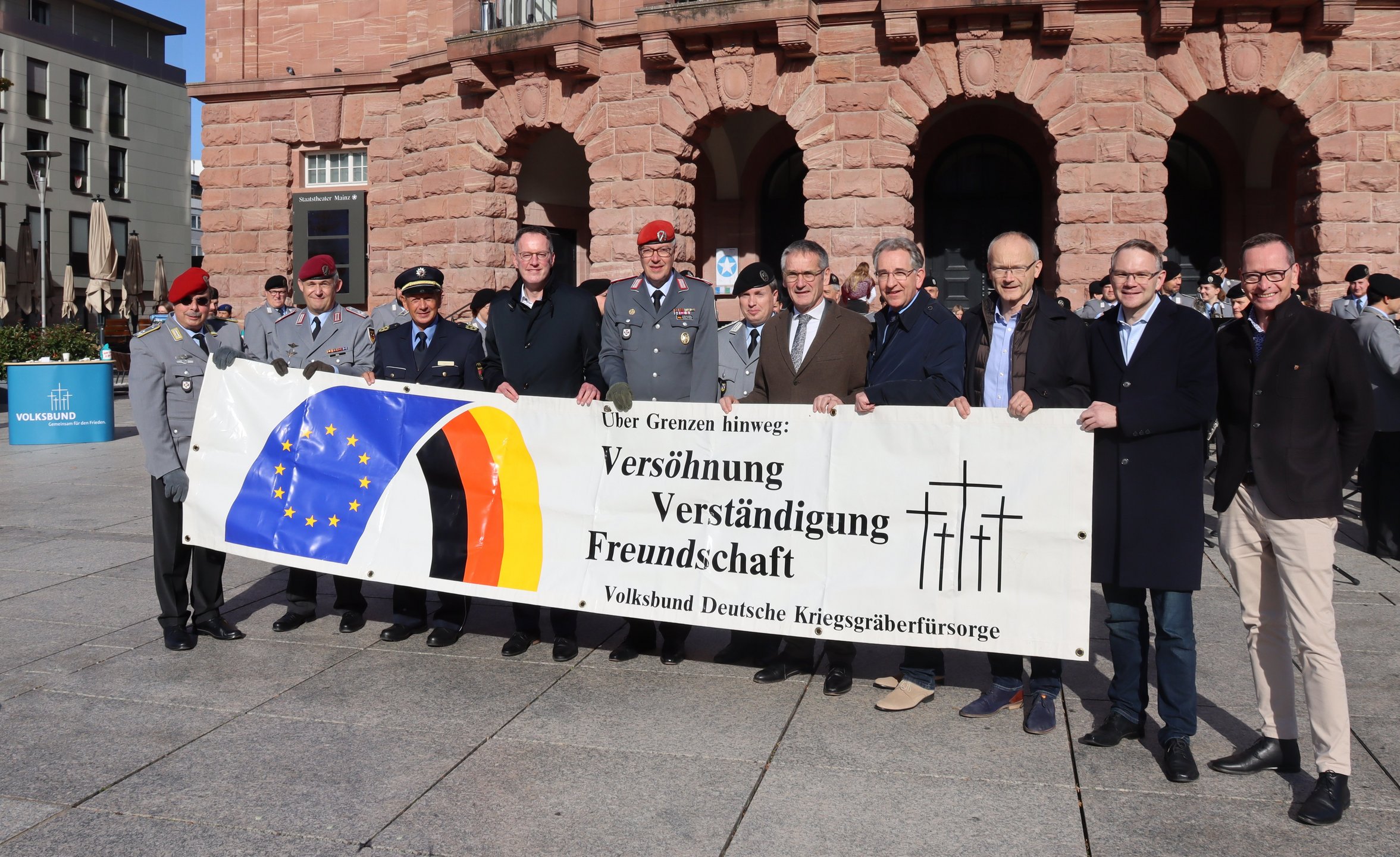 Prominenz der Stadt Mainz hatte sich angekündigt. Neben vielen Landtagsabgeordneten waren der Schirmherr des Volksbundes, Landtagspräsident Hendrik Hering, der zu dieser Zeit amtierende Oberbürgermeister Michael Ebling und der Polizeipräsident Reiner Hamm vor Ort anzutreffen. Am Informationsstand des Volksbundes konnten sich Interessierte über die Arbeit des Vereins informieren. Die Mainzer Bürgerinnen und Bürger spendeten sehr großzügig. Aus den Sammeldosen konnte ein Betrag von 1049,30 Euro gezählt werden, dieses Geld wird für die Friedensarbeit des Volksbundes eingesetzt und bereits zu den Einnahmen der Haus- und Straßensammlung 2022 gezählt. Wir danken allen Sammlerinnen und Sammlern und den Spenderinnen und Spendern für ihren großartigen Einsatz. Die Musikerinnen und Musiker, die extra aus Ulm angereist waren, haben ein unvergessliches Platzkonzert gegeben, vielen Dank hierfür!