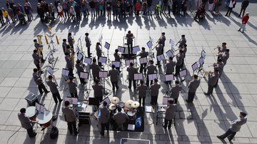 Treffpunkt war bei schönstem Sonnenschein der Theatervorplatz in Mainz. Hier unterstützte uns das Heeresmusikkorps Ulm. Wie in den vergangenen Jahren erhielt der Volksbund auch in diesem Jahr die Unterstützung durch die Bundeswehr, genauer durch das Landeskommando Rheinland-Pfalz.